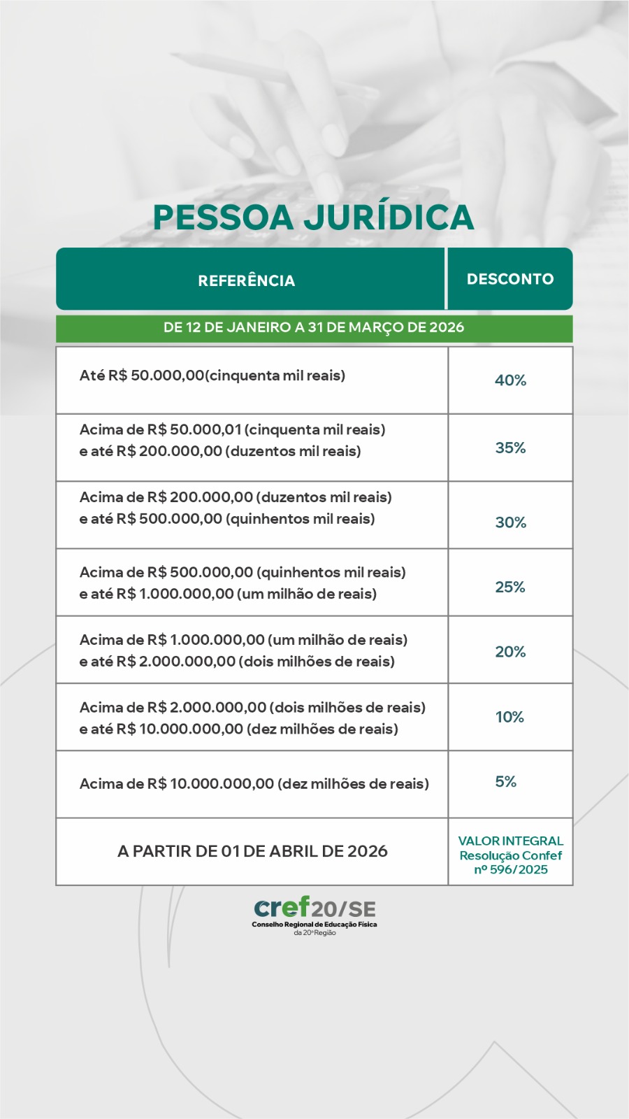 O Conselho Regional de Educação Física da 20ª Região Sergipe (CREF20/SE) publicou a Resolução nº 92/2025, baseada nas resoluções 595 e 596 de 2025 do CONFEF, que estabelece os valores, descontos e condições de pagamento da Anuidade 2026 para profissionais e Pessoas Jurídicas registrados no Sistema CONFEF/CREFs. As novas regras entram em vigor a partir de 1º de janeiro de 2026.