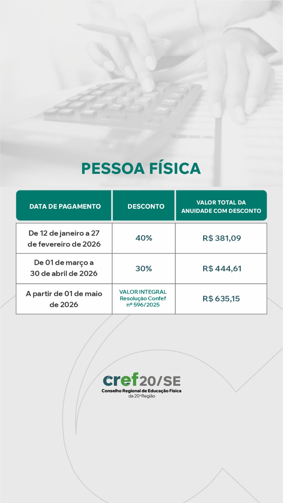 O Conselho Regional de Educação Física da 20ª Região Sergipe (CREF20/SE) publicou a Resolução nº 92/2025, baseada nas resoluções 595 e 596 de 2025 do CONFEF, que estabelece os valores, descontos e condições de pagamento da Anuidade 2026 para profissionais e Pessoas Jurídicas registrados no Sistema CONFEF/CREFs. As novas regras entram em vigor a partir de 1º de janeiro de 2026.